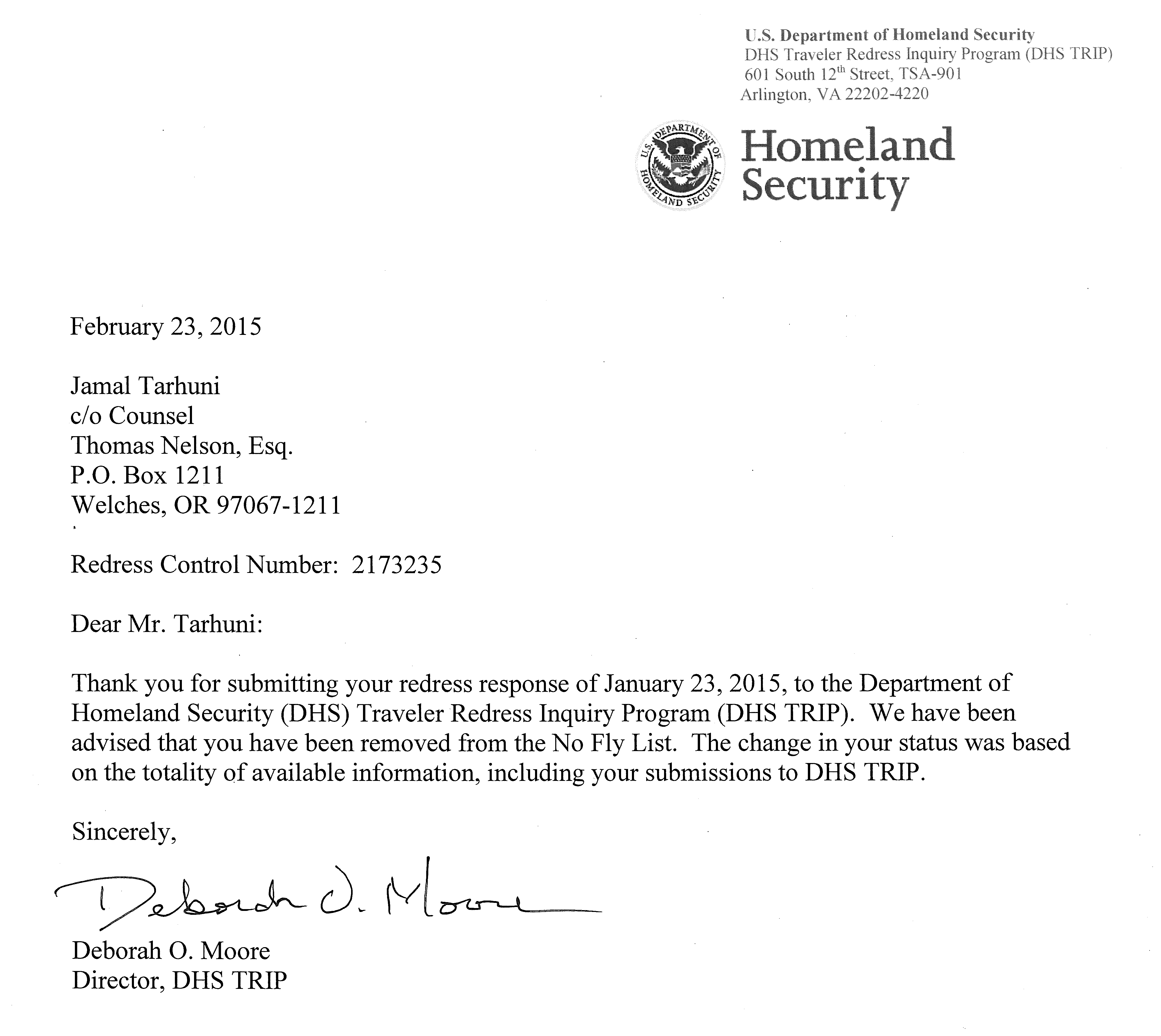 Just weeks before a scheduled March hearing in a Federal lawsuit brought by US citizen Jamal Tarhuni challenging his repeatedly having been prevented from boarding commercial airline flights, including flights back to his home in Oregon from overseas, the director of the DHS “Traveler Redress Inquiry Program” (DHS-TRIP) has sent Mr. Tarhuni the letter above, telling him that, “We have been advised that you have been removed from the No Fly List.”
