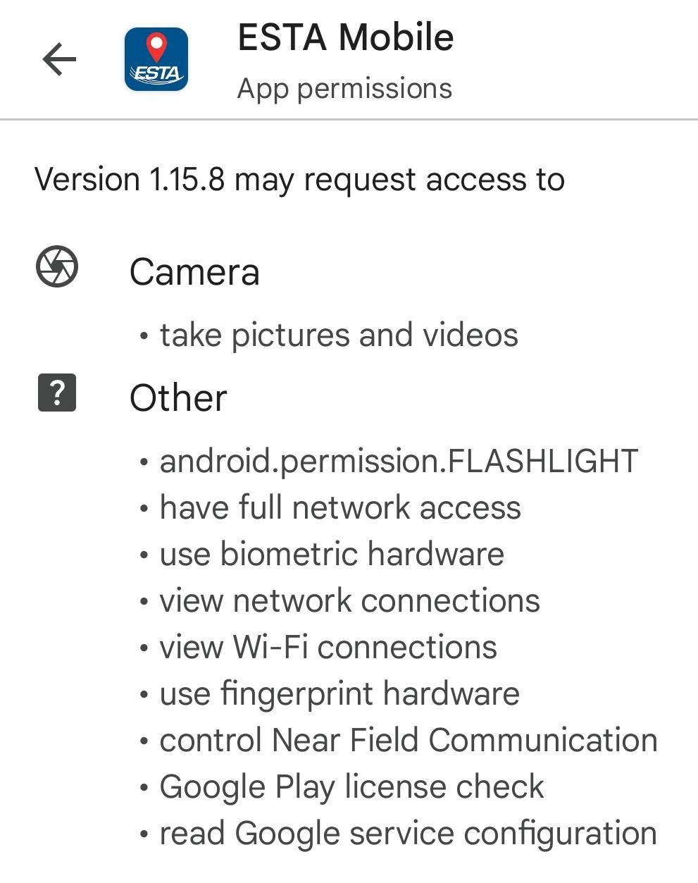 [Permissions requested by ESTA Android app. Why does CBP want to be able control your flashlight?]